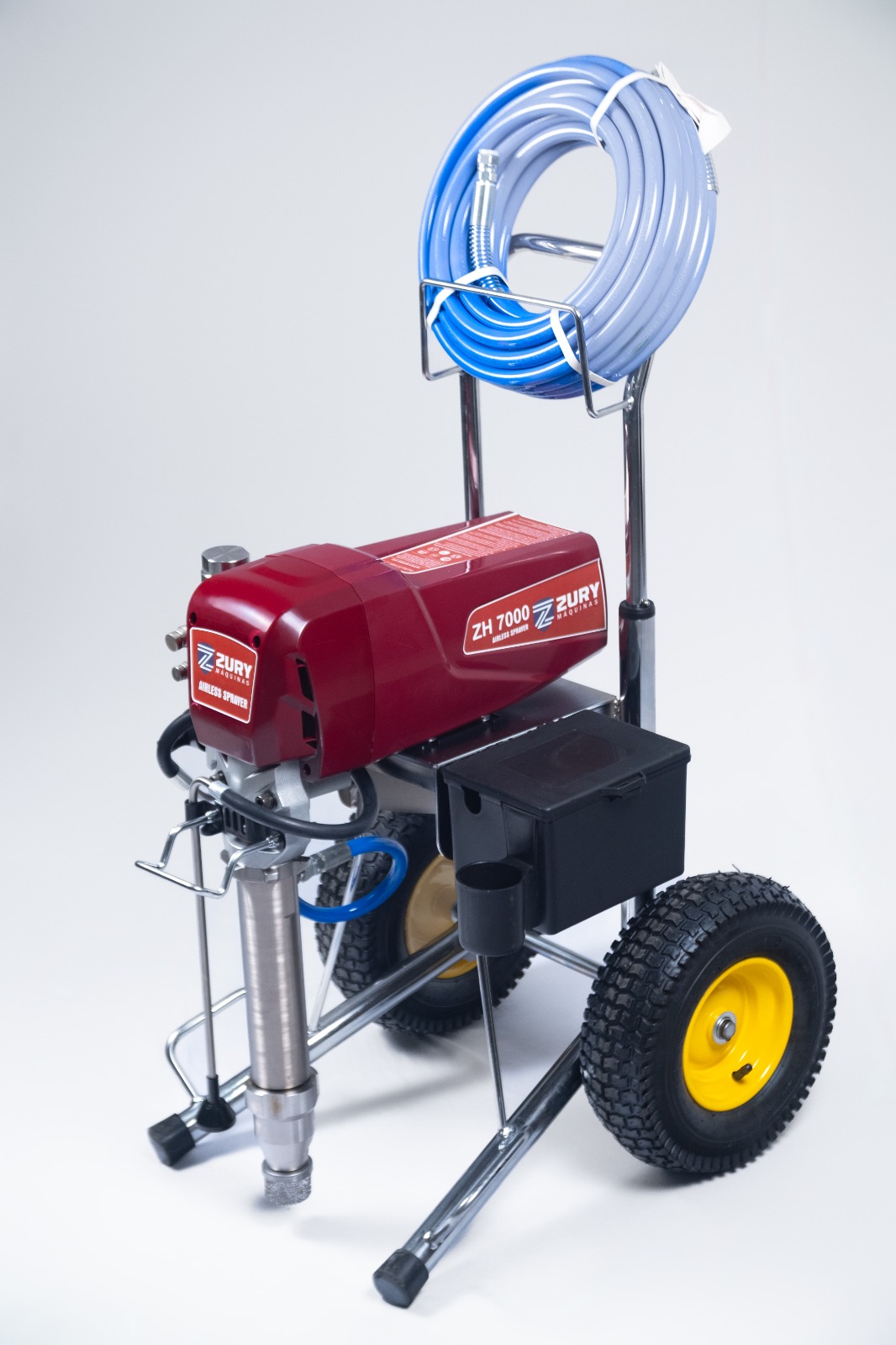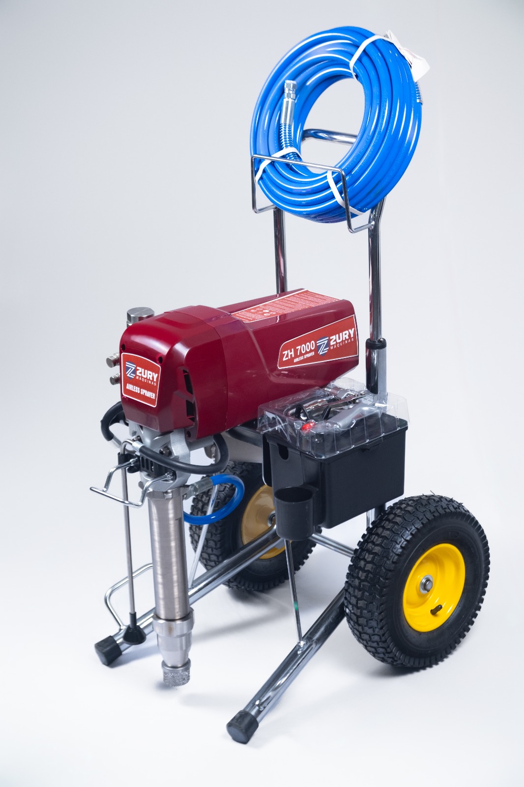 Máquina de pintura airless, indicada para pinturas na construção civil, com produtos pesados como: Massa corrida, Epoxi, Impermeabilizantes de alta viscosidade, pintura de telhado, produtos a base de água e solvente. Ficha Técnica: Voltagem 220v 50-60hz Potência do Motor: 4000W Vazão Máxima: 7 Litros por Minuto Motor sem Escova de Carvão